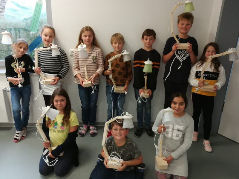 Die Kinder der 3. Klassen können in der AG Werken verschiedene Techniken im Umgang mit dem Werkstoff Holz erlernen und ausprobieren. Zusammen mit Frau Paukstat fertigen und gestalten die Schüler im Laufe eines Schuljahres eine eigene Tischlampe.